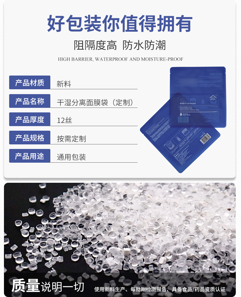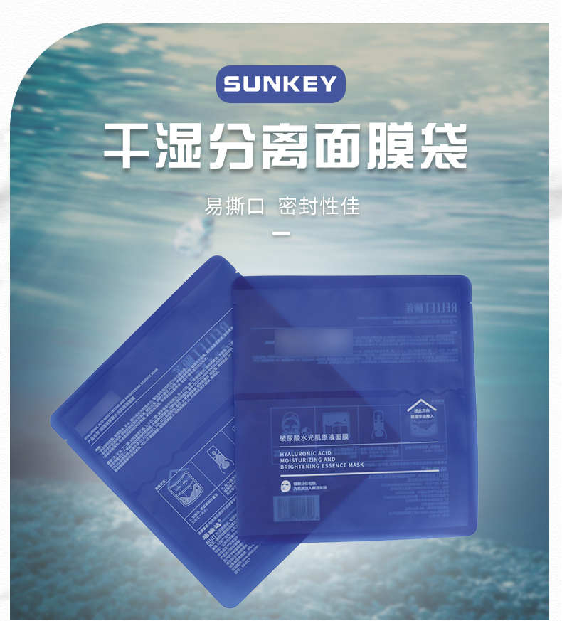 膜液分离的干湿分离面膜袋技术可以,使精华液可以独立包装,保证稳定性更优的情况下,还能减少某些添加剂的使用。面膜在使用前十几秒才解锁“浸泡”,既杜绝面膜纸中化工成分的析出,又能最大程度地保证活性成分的被最大程度地吸收,新鲜程度是传统浸泡式面膜无法比拟的。